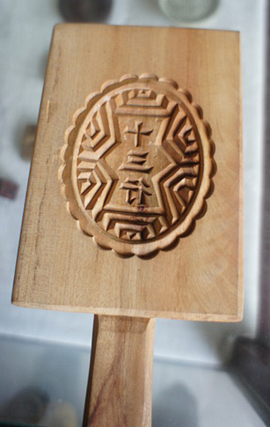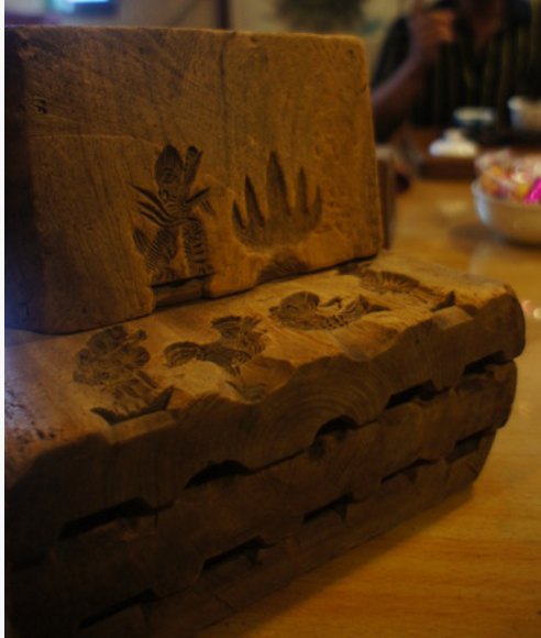 (房間一角有巨型粿印與糖模,居中者為仿古新刻,有過膝之高;最右者為結婚合親時所用的八角糖,或可為糕,或為鳳片)