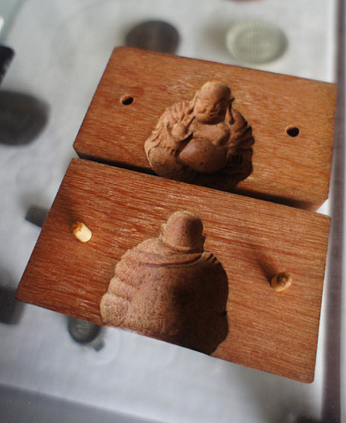 鄭永斌是台中石藝協會的會長,好客,拜訪當天他正訂製餐點要在明天酬謝會友及支錢幫助特展的朋友,幾通電話中是往返不覺得細心叮嚀,要餐點以讓人吃飽為原則、不讓人失禮;而他泡著茶藝,論著雕刻技藝,鑑賞著收藏物,牆上字畫羅舉,廟上的泥塑小像以籮筐盛裝在房間角落,「就是喜歡收藏,跟朋友一起玩,可以認識到木料上的漆、陶瓷上的釉、磚瓦的紋路辨別年代的款式,像這些糖塔模子在當初以便宜的價錢買到,因為我一眼就看得出那是糖模,糖模流通古董市場的機會幾乎沒有,因為很少糕餅店家的印模會流到市面,那些是專屬的,坊間容易買到的是大色貨,一般通用型的,比如紅龜粿、花糕等就容易見到,但是喜餅、糖模就很難!」一口收藏鑑賞經,想到高雄黃鳳鳥先生,都有種收藏怨念的堅持,各有千秋。