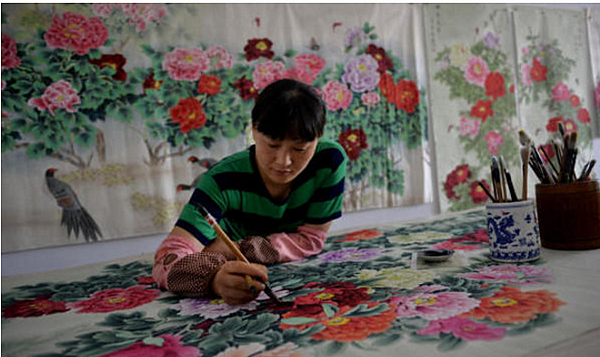 山東省西南邊的鉅野縣是聞名全中國的「農民畫鄉」,仲夏時節,這裡的農民們在清晨天氣涼爽時下地幹農活,而到了正午,他們就聰明地「躲」進冷氣房內細膩地繪畫著。一位婦人一邊為一幅巨型牡丹畫著色,一邊笑著說,「這些畫卷都是我們農民繪製的工筆畫。」