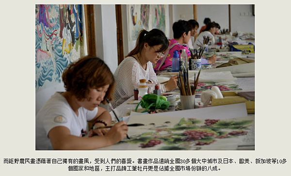 當有人稱他們的畫為「大師之作」時,這些農民會感到不好意思,「我們就是農民,用心畫好每一幅畫就好」,全中國知名畫店出售的工筆牡丹畫80%出自鉅野人之手。另一位作畫的農民說,她現在一個月能畫一幅12尺的牡丹工筆畫,畫畫一個月賺3、4000元(約台幣1萬5000元),農地裡的活還不耽誤的話,一年能有2份收入。