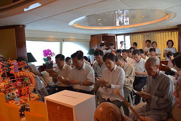 誦經 中華彌陀淨宗學會辦理「知遇法船」澎湖祈福法會,7日上午於第一漁港出發,於海上舉行超薦祈福法會,並釋放龍船及蓮花等,繞行虎井嶼海域附近,整個儀式進行兩個多小時。縣長王乾發、議長劉陳昭玲全程參與,虔心為澎