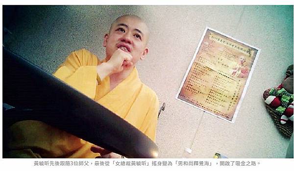 〔即時新聞/綜合報導〕嘉義市覺海禪寺一名男法師「釋覺海」,被周刊踢爆是曾自稱身價上億元的「台灣女阿甘」黃毓昕,他被控以消災解厄為由詐取高額費用,甚至要求信眾拿房貸款讓他投資,因此遭信眾控訴及提告。不過針對相關指控,釋覺海則稱他沒有拿錢,對於法會點燈要價10萬一事聲稱「都是按照信眾隨喜」。