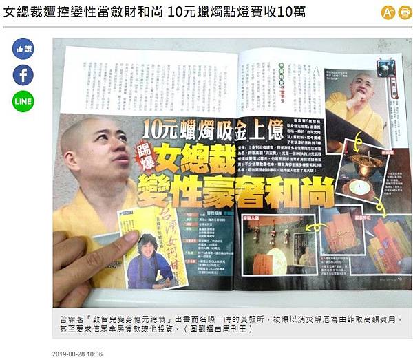 分享女總裁遭控變性當斂財和尚 10元蠟燭點燈費收10萬到Facebook 分享女總裁遭控變性當斂財和尚 10元蠟燭點燈費收10萬到Line