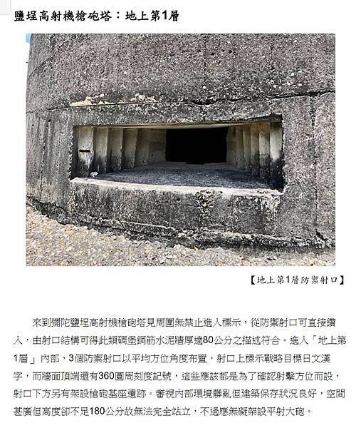 來到彌陀鹽埕高射機槍砲塔見周圍無禁止進入標示,從防禦射口可直接鑽入,由射口結構可得此類碉堡鋼筋水泥牆厚達80公分之描述符合。進入「地上第1層」內部,3個防禦射口以平均方位角度布置,射口上標示戰略目標日文漢字,而牆面頂端還有360圓周刻度記號,這些應該都是為了確認射擊方位而設,射口下方另有架設槍砲基座遺跡。審視內部環境髒亂但建築保存狀況良好,空間甚廣但高度卻不足180公分故無法完全站立,不過應無礙架設平射大砲。彌陀鹽埕高射機槍砲塔-高雄僅存完整二戰日軍子彈型防空塔探秘 @ 秘境探索研究社 :: 痞客邦 :: https://bit.ly/44z7Chs