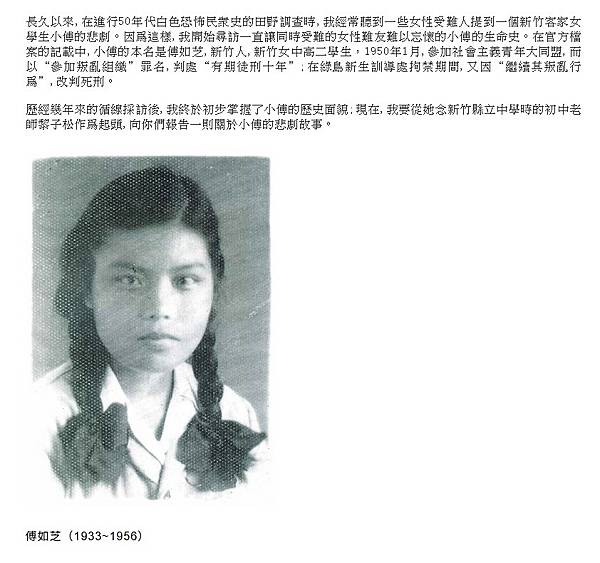 傅如芝(23歲)是新竹客家人,被捕時是新竹女中高二學生,和初中同班同學黃竹櫻、曾美容,參加老師黎子松的讀書會被捕。又被「社會主義青年大同盟」事件牽連,被指控「參與叛亂組織、繼續叛亂行為」遭老蔣槍決。