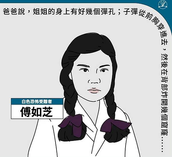 1998 年,傅如芝弟弟受訪時回憶起那天。學校中午突然通知家裡姊姊被帶走,沒有人知道發生了什麼事,也無從打聽她的下落。幾天後,家裡又來了五個拿槍的憲兵,進到傅如芝房間翻箱倒櫃後離開,一家人嚇得不敢說任何話。
