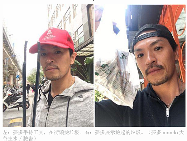 住在台灣已經超過15年的電視藝人「夢多」,就習慣天天清晨外出撿垃圾。這個習慣是父親從小給他最深刻的印象,來台灣定居之後,他延續了父親的這個習慣,一來紀念父親,二來,也是因為台灣街頭的垃圾菸蒂,實在太多。
