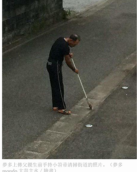 夢多上傳父親生前手持小笤帚清掃街道的照片。(夢多 mondo 大谷主水/臉書)