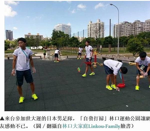 ▲來台參加世大運的日本男足隊,「自發打掃」林口運動公園讓網友感動不已。(圖/翻攝自林口大家庭Linkou-Family臉書)