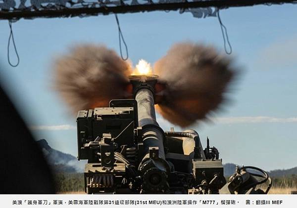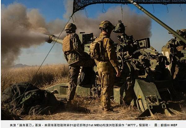 美澳「護身軍刀」軍演除海空聯合操演外,今天(21日)展現陸戰火砲能力,由美國海軍陸戰隊第31遠征部隊(31st MEU)和澳洲陸軍操作「M777」榴彈砲,提高對裝備的熟練程度。
