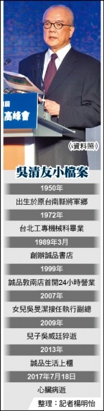 吳清友與女兒吳旻潔(誠品集團副董事長),原訂明(20)日一起出席誠品首本品牌專書《誠品時光》出版記者會,分享誠品創立10,000多天來的初心、挑戰、變革,與堅守不變的核心價值,剖析誠品品牌精神、經營策略、未來布局。隨吳清友驟逝,誠品接班問題也引起關注。