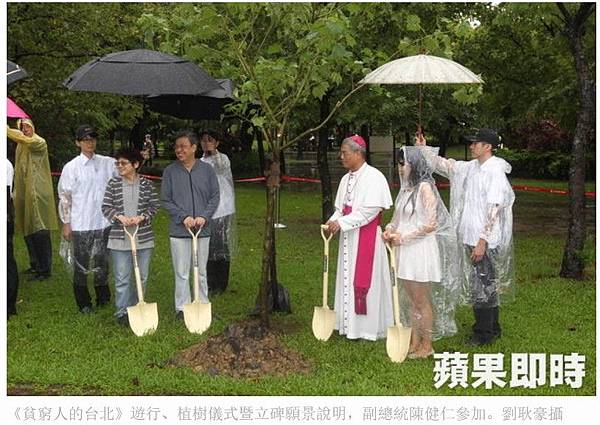 「向貧窮者學習行動聯盟」發起的「貧窮人的台北」系列活動,昨天在台北街頭有超過百人露宿街頭感受「一夜無家」後,今天再從愛國東路、杭州南路口遊行到曾是台北最大貧困眷村所在地大安森林公園舉行植樹儀式,副總統陳建仁到場主持儀式,與會者在其致詞時高舉「沒有人是局外人」的毛巾;陳建仁也當場回應,在這個世界上沒有人是局外人,大家都是一體的。陳建仁說,過去貧窮被認為是個人問題,現在都知道這觀點是錯誤的,所謂的貧窮是結構性壓迫、制度性不公平、剝削所造成的。今天的活動很有意義,是要對貧窮看見、聆聽、體驗、團結,每個貧窮的人都要得到足夠的人權保障,如果無法拒絕貧窮,台灣人權保障就是有所缺陷。陳建仁說,中央和地方政府要一起努力拒絕貧窮,面對貧窮不只要關切,還要人格提升跟社會合而為一,理解及解決貧窮問題是政府的責任,6月政府推動的兒童及少年發展帳戶,就是要提供經費要讓貧困家庭孩童可以得到健全身心發展。主辦單位說,1987年10月17日是第一次世界拒絕貧窮日,10萬名人權護衛者在巴黎自由人權廣場所做宣告,台灣也在1996年10月17日在大安森林公園種下「希望之樹」響應這活動,今天再由陳建仁、監察院副院長孫大川、台北市副市長林欽榮共同在大安森林公園種植三棵樹,象徵政府承諾未來要積極建立城市共榮的願景。主辦單位說,大安森林公園是電影《搭錯車》中孫越飾演的啞叔,被拆遷房子的原址,那裏曾是數千人的家園,希望未來能在大安森林公園立碑,期盼社會共生共榮。(洪敏隆/台北報導)
