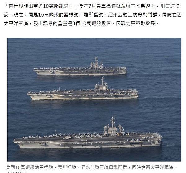 「向世界發出重達10萬噸訊息!」今年7月美軍福特號航母下水典禮上,川普這樣說。現在,同是10萬噸級的雷根號、羅斯福號、尼米茲號三航母戰鬥群,同時在西太平洋軍演,發出訊息的重量是3個10萬噸的數倍,因戰力具乘數效果。