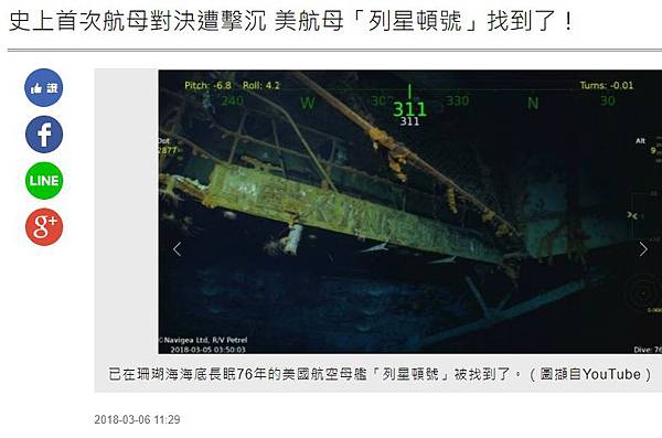 分享史上首次航母對決遭擊沉 美航母「列星頓號」找到了!到Facebook 分享史上首次航母對決遭擊沉 美航母「列星頓號」找到了!到Line 分享史上首次航母對決遭擊沉 美航母「列星頓號」找到了!到Google+