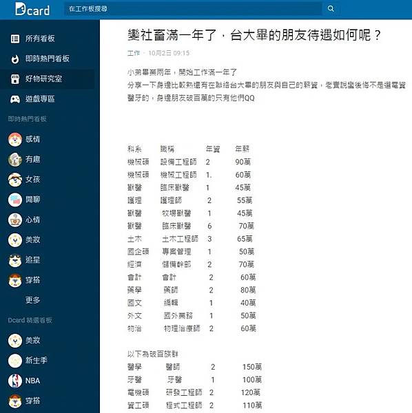 根據該名網友的身邊統計資料,國文系畢業當編輯年薪約40萬元、獸醫系當牧場獸醫45萬元、外文系當國外業務50萬元、國企碩擔任專案管理50萬、護理系當護理師55萬元、會計系當會計和物治系當物理治療師60萬元,機械碩擔任工程師則有60-90萬不等。至於破百萬的朋友,是擔任牙醫、程式或研發工程師和醫師。