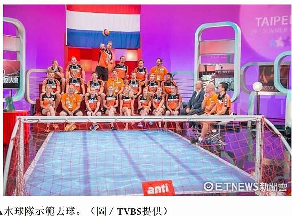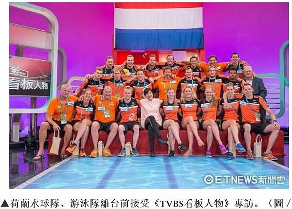 台北世大運落幕,其中最令人印象深刻的國外隊伍,首推荷蘭帶來的「橘色旋風」,開幕前水球隊的英姿在網路瘋傳,造成門票搶購一空的盛況。荷蘭水球隊、游泳隊離台前接受唯一一次電視專訪,攝影棚擠爆百人圍觀拍照,連教練都忍不住笑說:「是整棟樓的人都來了嗎?」