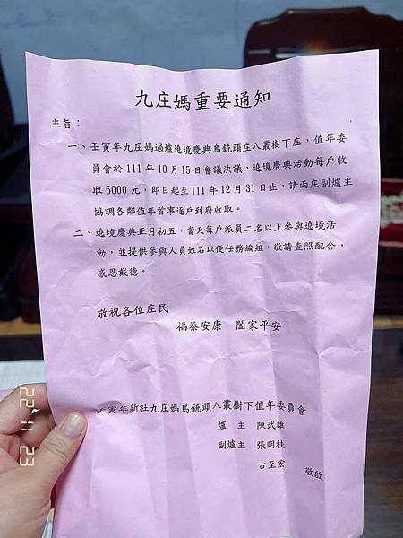 -民眾在臉書「我是新社人」po文表示,最近接獲粉紅色通知單,上面註明「壬寅年九庄媽過爐遶境慶典鳥銃庄八叢樹下庄,值年委員會於10月15日會議決議,遶境慶典活動每戶收取5000元,即日起至12月31日止」。