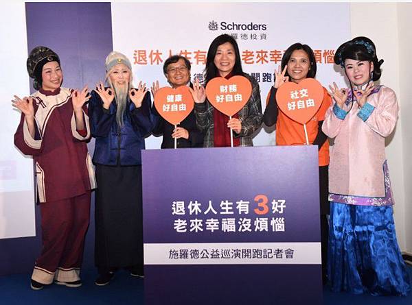 根據內政部104年統計顯示,國人平均壽命不但逐年攀升達80.2歲,且台灣百歲以上人瑞首度突破3,000人,20年來約增5倍! 面對高齡長壽社會,施羅德投信特別推出全台第一個參考OECD(經濟合作暨發展組織)三大幸福面向(財務、健康、社交)所設計的退休幸福指數,結果發現台灣退休族的退休幸福指數平均達73.4分,健康分數超過80分最高,但財務分數最低僅65.9分;且隨著年齡增加,年長者擔心手邊經濟不能負擔未來一輩子生活的憂慮度愈高,顯現長壽風險已成為國人隱憂。 面臨高齡現象,調查發現退休後幸福的三「好」要件為:健康好自由、社交好自由、財務好自由,施羅德建議國人應掌握幸福退休333口訣,並透過再次與弘道老人福利基金會合作,推出《幸福彭祖有三好》歌仔戲全台公益巡演活動,提倡幸福退休生活,落實社會企業責任。
