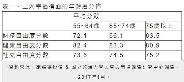 「施羅德退休幸福指數大調查」參照OECD區分為財務自由度、健康自由度、社交自由度三大構面,針對55歲以上的退休者進行訪談。以三大面向來看:國人健康自由度的平均分數超過80分,為三個構面中最高;其次為社交自由度分數為74.1分;最低分者為財務自由度65.9分。 國立政治大學鄭宇庭教授指出,國人健康自由度較高,應歸功於台灣擁有完善的健保制度,加上政府致力於打造友善高齡環境,持續推廣「活躍老化」概念以守護台灣退休者的健康,讓台灣退休族群的自我健康感受較佳。 進一步分析年齡對三大面向的影響後發現,各年齡層受訪者在三個構面的自評分數會隨年齡增長而有所更迭,但變動幅度均不大;唯財務自由度明顯看出會隨著年齡增長而大幅驟減,年紀越大財務壓力越重,顯示台人退休越久,財務憂慮度越大。