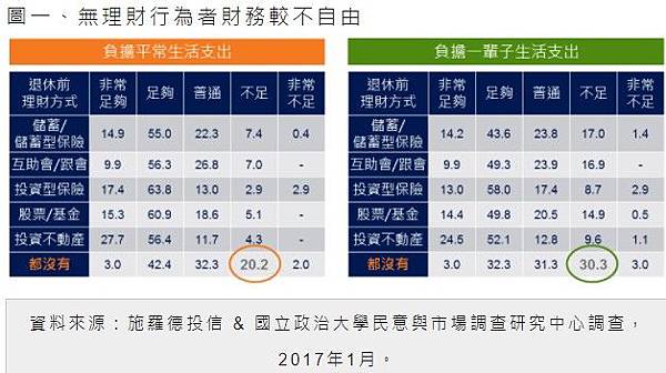 由《遠見雜誌》、施羅德投信、政治大學商學院資料採礦中心共同進行的「2017台灣退休幸福指數大調查」,今日公布調查結果,結果顯示台灣退休族在生活與健康自由度表現較佳,但財務自由度卻不及格,資金缺口平均達420.3萬元。《遠見雜誌》副主編林讓均分享調查結果指出:「退休幸福指數調查分為財務、生活、健康三個項目,解析台灣退休族是否過著有品質的退休生活,然而調查發現台灣55歲以上退休族群,儘管在健康自由度分數達到73.2分,生活自由度為66.5分,但財務自由度卻不及格,只有59.2分。」林讓均分析,國人在財務自由度面相分數最低的主要原因是不管在退休前或退休後都不理財,而就算有理財者,有超過5成的受訪者退休前選擇的理財工具為儲蓄或是儲蓄型保險,其次則有28%的人選擇投資股票/基金。前金管會主委、現任中華民國退休基金協會理事長王儷玲指出,退休後的財務應該在退休前準備好,但這不太表退休後不需要理財,王儷玲建議應該規劃現金流,例如將大部分資產放在債券,以獲得穩定債息收入,或將長壽風險轉嫁給年金險,確保在老都有可支應的現金。記者會現場也找來許多超級銀髮族分享其退休心得,83歲的邱樹嘉現在還能踩高蹺彩衣娛人,80歲的潘秀雲被媒體稱為「噴射機阿嬤」,現在還在積極訓練,希望能在年底的亞洲常青田徑錦標賽再為中華隊奪下金牌。退休幸福指數大調查-台灣老人健康好、社交佳 惟財務拉警報 -- 上報 / 消費 - https://goo.gl/c2jbQy