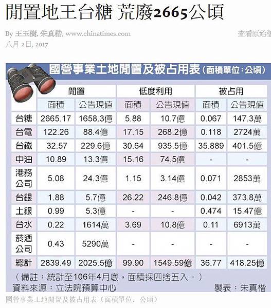 報告指出,台糖、台鐵局及台電等9家國營事業,閒置土地面積就占2839.4895公頃,公告現值2025.49億元。