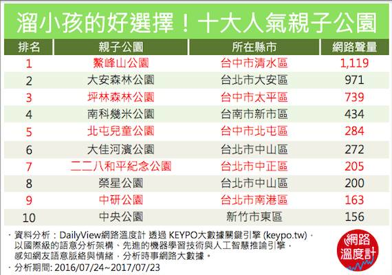 所以如果住家附近就有親子公園,那肯定要給一個讚,因為帶孩子去公園跑一跑,第一省錢、第二省時、第三效果好(小孩回家秒睡),今天DailyView網路溫度計透過《KEYPO大數據關鍵引擎》要幫大家整理出網友討論聲量最高的全台十大親子公園,讓阿公阿媽阿爸阿母可以帶小孩輕鬆瘋一「夏」!