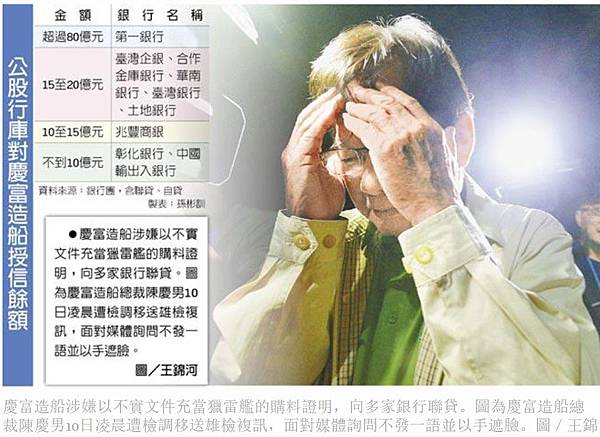 建造6艘獵雷艦變成詐騙案?第一銀行等9家行庫去年2月與國內最大民間造船廠之一的慶富造船完成205億元聯貸案簽約,資金將用於規劃建造6艘獵雷艦,卻驚傳慶富集團涉嫌在銀行聯貸後以不實文件充當獵雷艦購料證明,因此遭高雄地檢署指揮調查局南機站搜索慶富集團總部等14處。