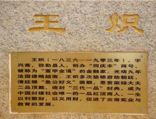 王熾青年時鬥毆殺死表兄姜庚逃至四川重慶,與旅渝滇商合營「天順祥」商號,來往川滇互貿。隨後又與席茂之在昆明合資開設「同慶豐」商號。數年經營,成為滇中富商。英國《泰晤士報》曾對百年來世界最富有的人進行統計,排在第四位的便是王熾。而且,他是唯一一名榜上有名的中國人。中國封建社會唯一的一品紅頂商人。民間稱為「錢王」。