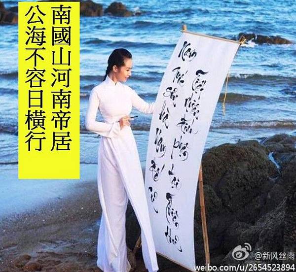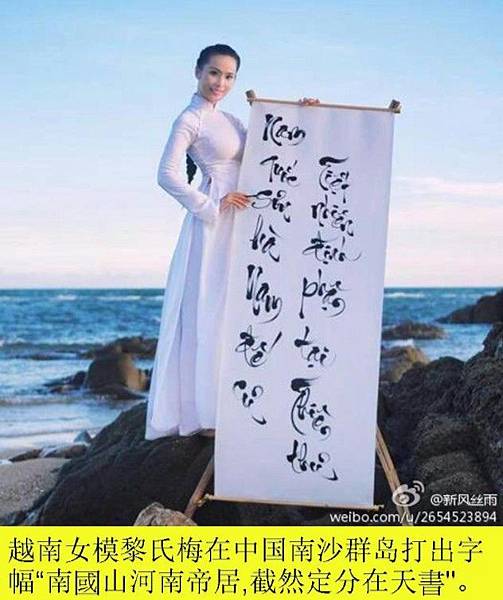 越南美麗女模特兒黎氏梅,在中国西沙群岛附近打出越南文字巨幅字幕公然挑衅中國南沙群島指權。寫的是越南李朝時代李常杰《南國山河》詩的前兩句:"南國山河南帝居,截然定分在天書"。宋越熙寧之戰時,在如月江、富良江一帶交戰,李常杰為鼓舞越軍士氣寫了這首詩。此詩現在專門運用在對中國抗議的各種場合。相對於李登輝說釣魚台是日本的,謝長廷不護漁卻幫日本美化其暴力惡行欺負台灣漁民,蔡英文政府居然不顧聯合國決議將沖之鳥礁去礁以媚日,台奸何其無恥!