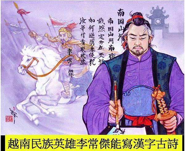 李常傑(1018年-1105年),是越南李朝的一位宦官和將領,亦是李太宗、李聖宗及李仁宗三朝元老,尤以李仁宗時期他的表現最為活躍,並且成為李朝與宋朝交戰的主要將領。1076年(李太寧五年),李常傑與北宋軍隊在如月江、富良江一帶交戰時,軍隊竟無心戀戰。某夜,軍隊裡忽然聽到這樣的詩句而重拾戰意:南國山河南帝居,截然定分在天書。如何逆虜來侵犯?汝等行看取敗虛。