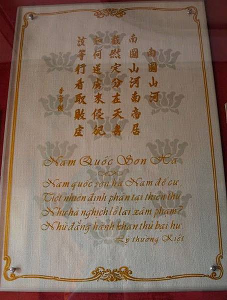 這是越南古代李朝的將軍李常傑在對抗宋朝入侵者時的宣言,在越南歷史中非常重要,甚至被越南歷史名家陳仲金視為是越南第一則獨立宣言。這首詩沒有太多文學技巧,翻譯成白話就是:「我家有自己的皇帝,這是老天也知道的事情,你想來鬧事?等著被打跑吧!」