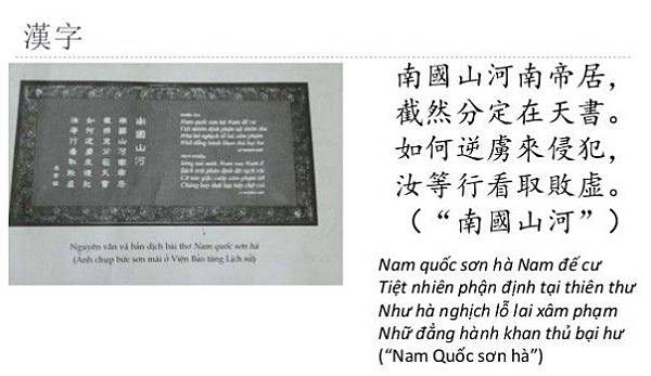 這首詩的重點不是文學敘事技巧,而是背後代表的越南民族認同建構。越南從秦朝就被中國直接統治,漢代時曾經由原本秦朝將領趙佗在兩廣跟越南北部建立南越國,後來又被漢朝合併。一直到唐朝瓦解,五代十國時候才自立為交趾國,卻一直被中原王朝當成地方割據政權。然而從這首詩中,我們卻可以看見當時越南人的國族認同,這難道不也是反思「華夏中心論」的契機嗎?