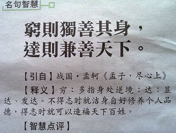 「窮則獨善其身,達則兼善天下」不得志的時候就要潔身自愛,精進自己的道德修養,得志的時候就要努力讓天下人就是指百姓都能得到好處