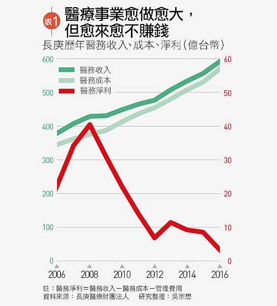 攤開長庚醫院歷年財報,2008年,也就是台塑創辦人王永慶過世的那一年,長庚醫院的醫務淨利還有40億台幣。2016年,長庚醫院的醫務收入591億元,來自醫務的淨利3.21億元;非醫務的淨利99.4億元,主要來自長庚持有台塑四寶分配的股息,讓長庚醫院稅前淨利達到102億元。顯見長庚醫院的醫務淨利已不到當年的十分之一。(見表1)