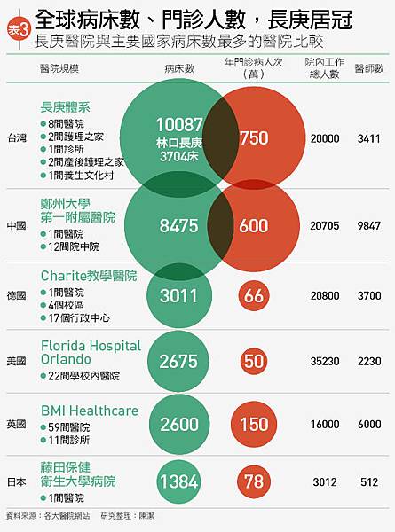 王永慶交給女兒的長庚,是規模世界第一的醫療集團,如今醫務收入卻瀕臨虧損。長庚總床數超過1萬床、年看診量750萬人次,世界第一(見表3);在肝臟移植、整形外科等領域,有著亞洲、世界級的頂尖成就,也是台灣最肯給錢讓醫生做研究的醫院;長庚醫院的管理,更是台灣私立、財團法人醫院的學習對象。