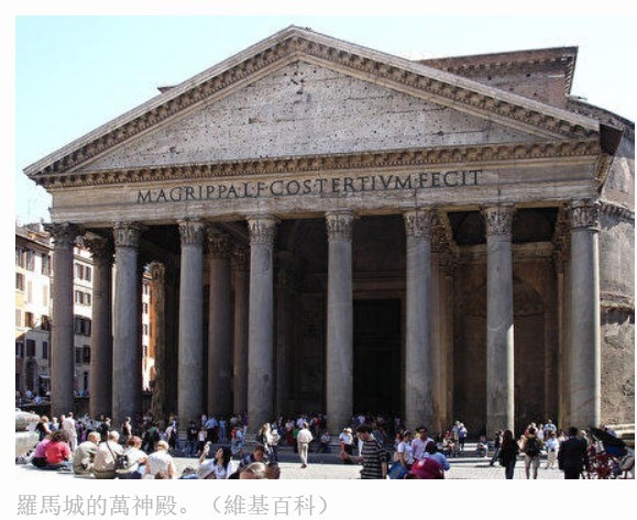 到羅馬城的第一站,當屬萬神殿(Pantheon)。萬神殿建於公元前27年,后經歷史演變,其正式名稱現為聖母與諸殉道者教堂(Santa Maria ad Martyres)。其主體呈圓形,穹頂直徑達43.3米,穹頂的最高點高度也是43.3米。頂部直徑為8.9米的圓形大洞是萬神殿內唯一的採光點,站在殿中,光線從頂部傾瀉而下,令人頓感神聖莊嚴。萬神殿圓形主體的前方有一個寬34米、深15.5米的柱廊,16根高達12.5米的柱子威嚴矗立,每根都是用整塊花崗石製成,底部基座直徑1.43米。這種圓廳加柱廊的設計,后被應用於許多著名的建築物,如北京清華大學的清華大禮堂。萬神殿是古羅馬建築藝術的結晶,對西方建築史的影響舉足輕重。