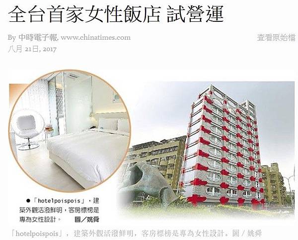 台北都會出現全台第一家「女性飯店」。為活化土地資產,國礎建設機構所屬富裔實業多角化經營跨入觀光餐旅事業,除成立快意管理顧問公司,在台北購地自建的時尚設計風格精品旅店「hotelpoispois」並已在日前試營運,新飯店預計9月27日正式開幕。