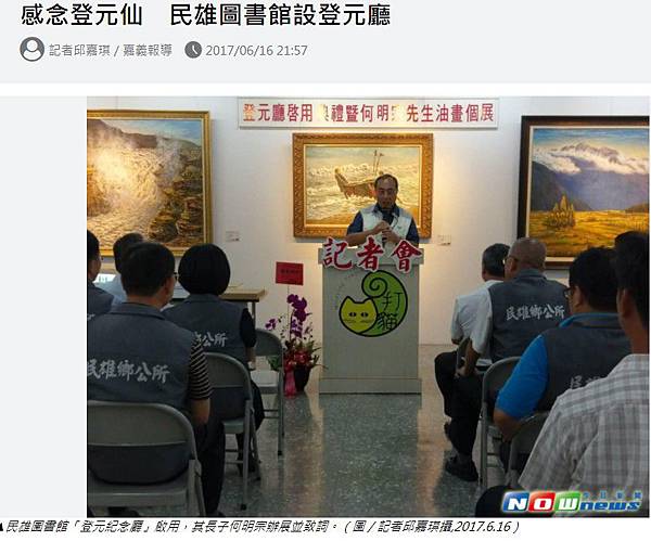 嘉義民雄圖書館原為「登元圖書館」,由教育家,也是油畫家何明宗父親何登元於43年前捐建,後因應實際需要拆除興建新館,為感念於鄉間積德立善的「登元仙」,公所將該館五樓多功能廳訂名為「登元紀念廳」,16日舉辦啟用典禮,何登元長子何明宗同時舉辦油畫個展,為地方寫下一椿美事。