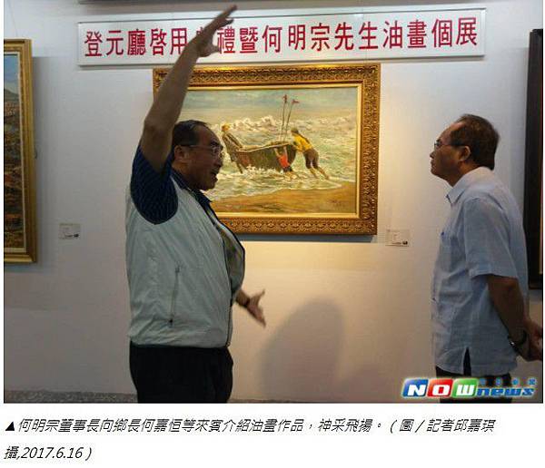 ▲何明宗董事長向鄉長何嘉恒等來賓介紹油畫作品,神采飛揚。(圖/記者邱嘉琪攝,2017.6.16)