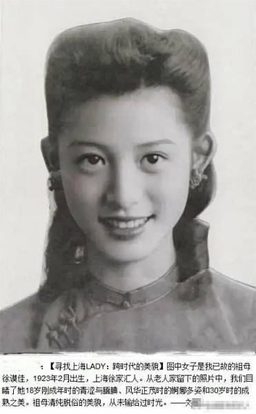 徐謨佳這張照片,被其孫劉都傳到微博上之后,一夜之間就獲得60多萬的點擊,網友驚呼美如天人, 簡直可以「秒殺」民國四大美人,給她冠上「最美上海Lady」的稱號!那麼這位長壽達90歲的民國佳麗,為何生前籍籍無名?她的身世、經歷如何?相對于同一時代大紅大紫的美女,比如阮玲玉、周璇、胡蝶、林徽因、陸小曼等人,她是一種不幸嗎?