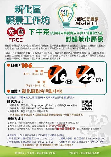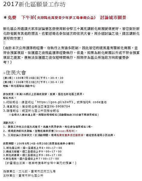 新化區所辦理「新化區願景工作坊」,經兩次住民大會分組討論,共有12組120人參加,依據「新化商圈」及「新化願景」各提6案,各印製1萬4千多份「選舉公報」發放到各住戶,本月14日至20日進行投票,16歲以上市民均可投票,前天開票,總投票數為2769票,其中新化區民有1971票。