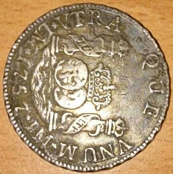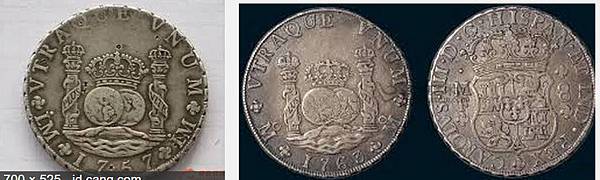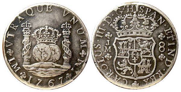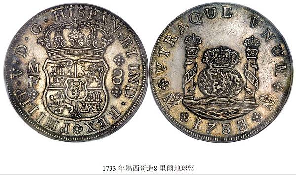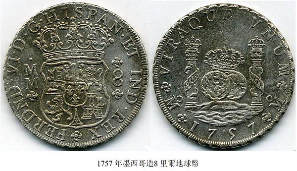 1732 年,墨西哥城鑄幣廠停止鑄造十字銀,開始用機器鑄造鑄 “地球幣”。此時西班牙原先的哈布斯堡王朝已經被法國波旁王朝所取代。哈布斯堡王朝在西班牙的最後一個國王卡洛斯二世無後,所以當時法國國王的弟弟菲利普五世成為西班牙的國王。從1732 年開始到1771 年為止,”地球幣”幣歷經西班牙波旁王朝的菲利浦五世、菲迪南六世和卡洛斯三世3 個國王。
