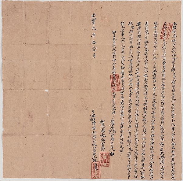 這是〈咸豐元年11月北投社番業主羅眉聖立胎借番租字〉。