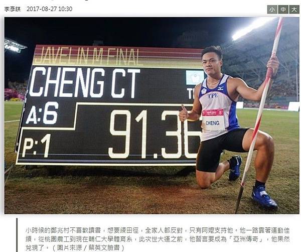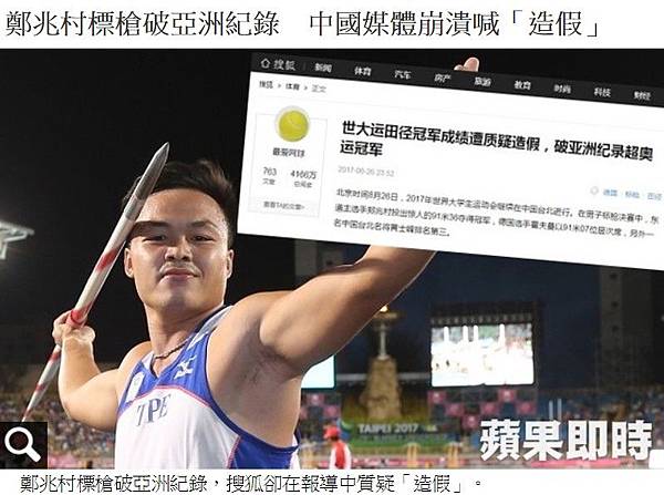台灣標槍好手鄭兆村在今年世大運中,擲射出破亞洲紀錄的91公尺36佳績奪金,是亞洲第1個破90公尺名將,鄭兆村因此登上國際田徑總會(IAAF)官網,但卻有中國媒體質疑疑鄭兆村的紀錄不純,並以「造假」為標題。