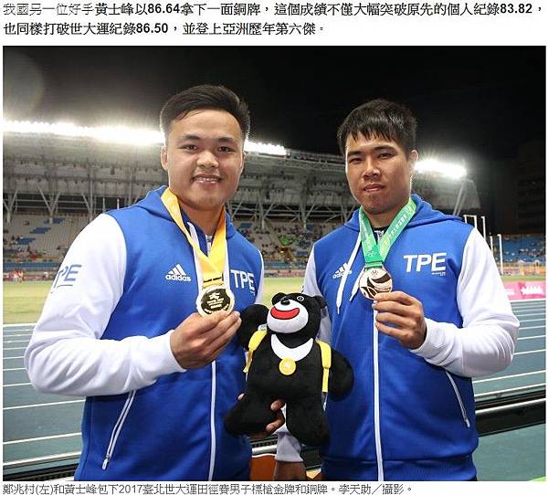 台北世大運第9天,台灣健兒在田徑場上連爆驚奇,鄭兆村在標槍最後一擲,石破天驚以91.36公尺,打破中國選手趙慶剛保持的89.15公尺亞洲紀錄,勇奪金牌,讓台灣運動迷再次沸騰。