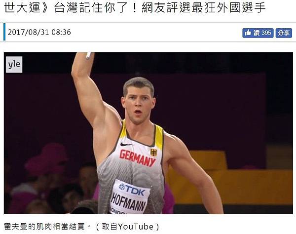 〔體育中心/綜合報導〕台北世大運正式落幕,台灣運動員締造不少經典時刻,不過也有外國選手相當活躍,讓國人留下印象,不少網友認為,德國標槍名將霍夫曼(Andreas Hofmann)是讓人印象最深刻的選手。