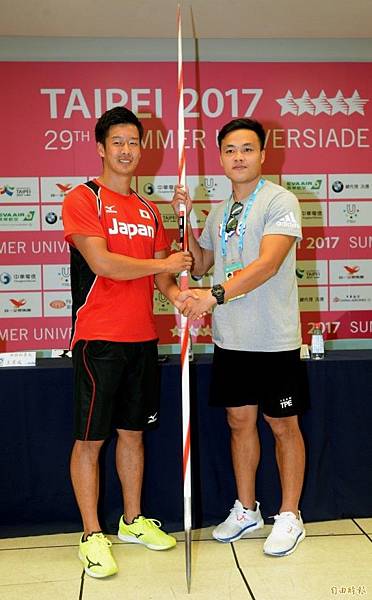 鄭兆村(右)日前在世大運男子標槍決賽中打破亞洲紀錄所使用的標槍是來自日本隊的選手...