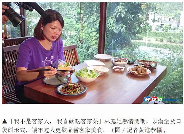 「生菜有酥脆感, 放在口袋餅內」林庭妃穿著紫色襯衫,從台中新社薰衣草森林風塵僕僕趕來苗栗山城三義的桐花客家村,笑容可掬的她,化身美食天使,在電視機攝影鏡頭前,真摯分享她的美食觀,「客家小炒加進去,用新方式來吃客家料理」,薰衣草15歲了,林庭妃臉上些許皺紋,但她依然是當年和創業夥伴如今已在天堂詹慧君時的陽光模樣,眼神澄澈,自在快樂。
