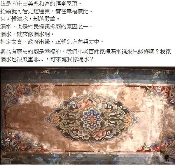 牆面上,拜亭的彩繪,都是水漬和斑駁的痕跡,這些在專家學者眼中的寶,廟方卻不以為然。去年,廟方要重新粉刷,差點連李登勝的彩繪就不保。永和宮的主委說,文化價值我不懂啦,但捨不得讓庇佑地方的神祇住在逢雨必漏的老廟,才會想蓋新廟。