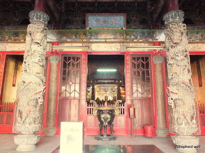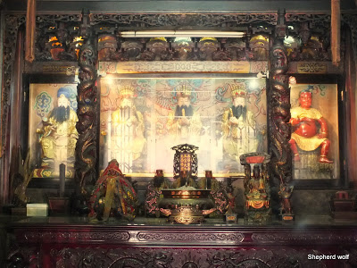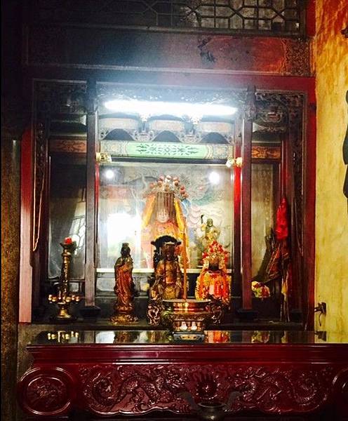 這個廟主體是手工榫接的,那這座廟的木雕很精彩,泥塑很精彩,彩繪是是名師李登勝的作品,匾額是白崇禧的墨寶,還有它的這個隔扇門,是玻璃的,但是帶有那個,現代裝飾藝術風格的廟門,還有祂那神像的部分,的泥塑也是很精美的。